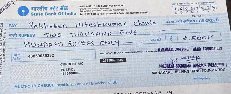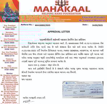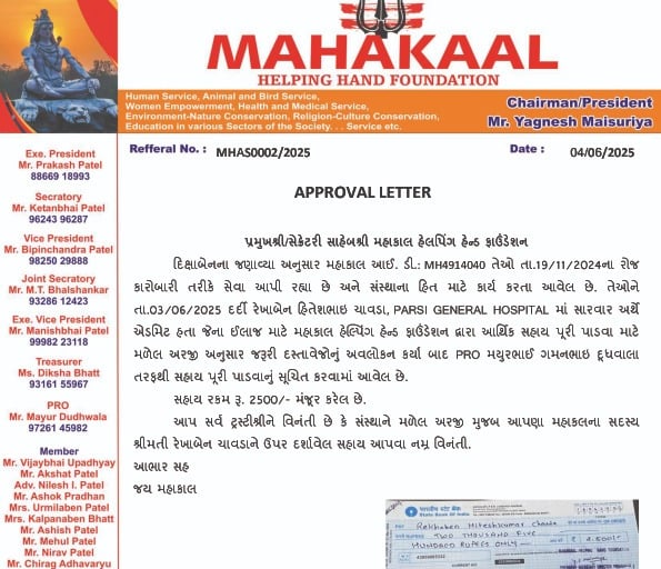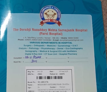 🌿 हृदय से आभार 🌿 Parsi Hospital में उपचार के दौरान मुझे प्रदान की गई आरोग्य सहायता के लिए मैं हृदय से आभारी हूँ। इस सहायता ने न केवल मुझे स्वास्थ्य की सुविधा दी, बल्कि मानसिक रूप से भी संबल प्रदान किया। आपका यह सहयोग मानवता और करुणा का एक जीवंत उदाहरण है । मैं सदा आपकी ऋणी रहूँगी। खास कर के हमारे PRO मयूरभाई दूधवालाजी / दीक्षा भट्ट भगवान आपको दीर्घायु, उत्तम स्वास्थ्य और समृद्धि प्रदान करें – ऐसी शुभकामनाओं सहित। 🙏 बहुत-बहुत धन्यवाद 🙏